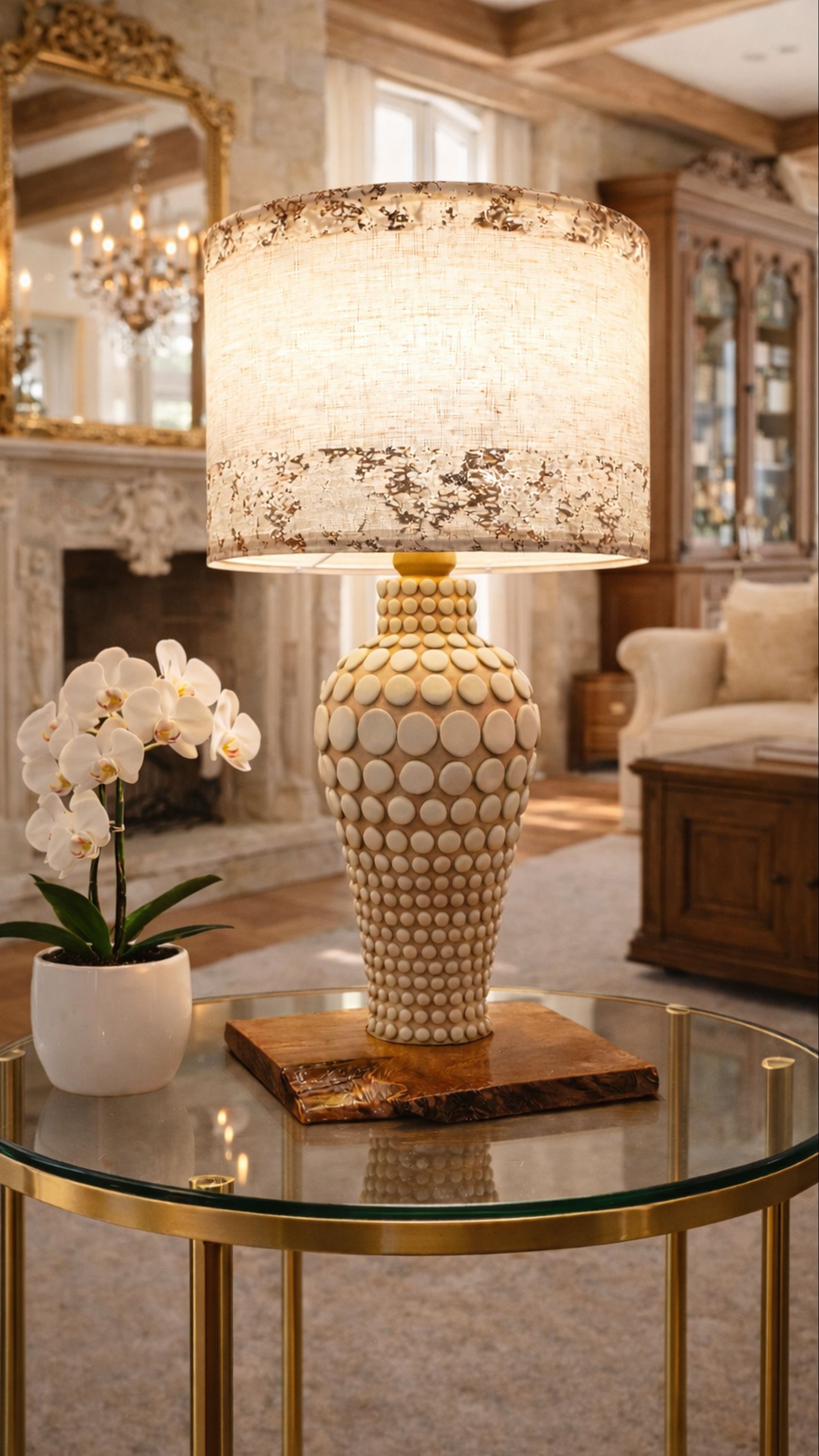 Decorative table lamp featuring a sculptural vase-shaped base adorned with evenly spaced circular relief details that create rich texture and dimension. The wide drum shade with subtle marbled-style accents diffuses light into a warm, inviting glow. Finished with a natural wood base, this piece blends artistic detail with timeless elegance — ideal for living rooms, bedrooms, or accent tables.