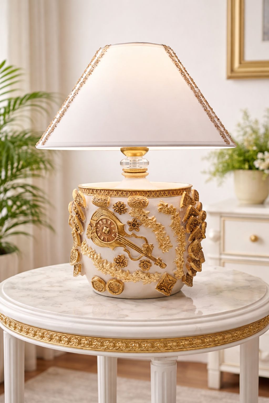 Ornate decorative table lamp featuring a oval ceramic base adorned with intricate raised gold detailing and classical-inspired motifs. The wide, angular fabric shade with embellished trim casts a soft, elegant glow, while crystal and gold-tone accents at the neck add refinement. A luxurious statement piece suited for formal living rooms or traditional interiors.