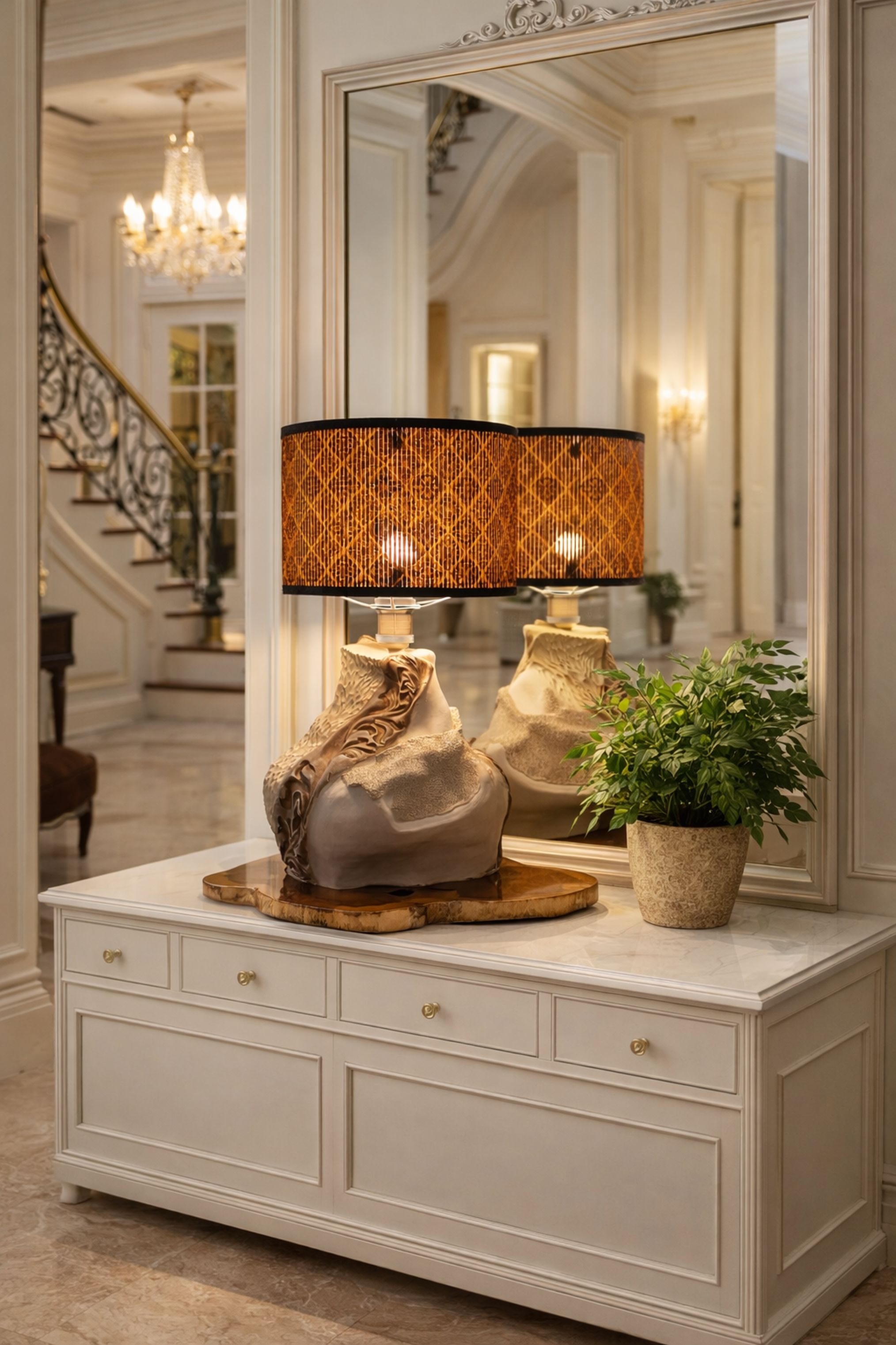 Statement table lamp featuring a sculptural, stone-inspired base with layered textures and a carved wood accent detail. The patterned drum shade with dark trim casts a warm, ambient light, while the natural wood slice base adds an organic touch. A striking blend of rustic artistry and refined design, ideal for consoles, entry tables, or living room accents.