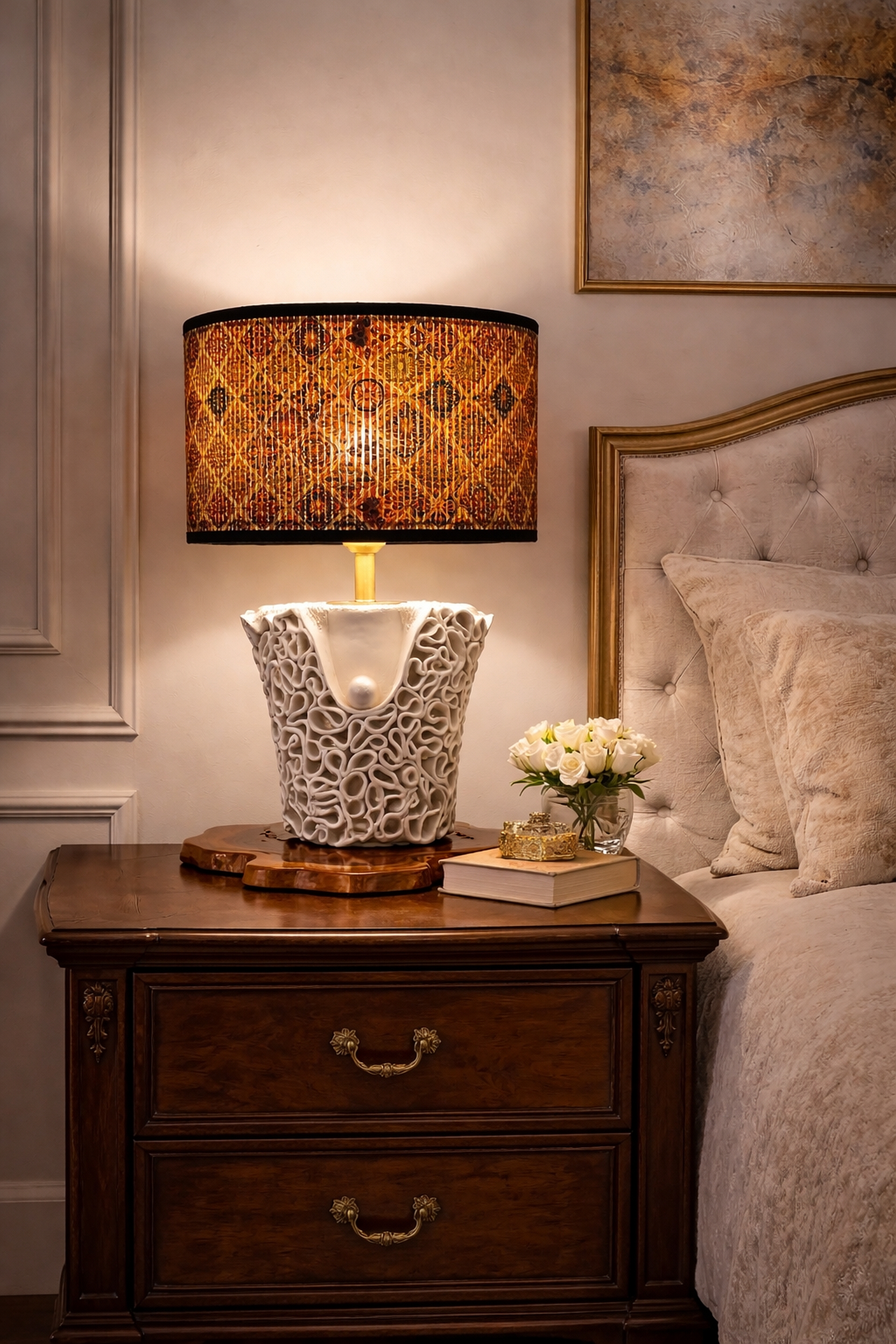 Elegant table lamp featuring a sculptural white base with an intricate openwork pattern and smooth central accent detail. Topped with a decorative drum shade in a rich, patterned fabric, the lamp casts a warm, ambient glow. Finished with a brass-toned stem and set on a polished wooden base, this piece blends artistic texture with classic sophistication — ideal for bedside tables or living room accents.