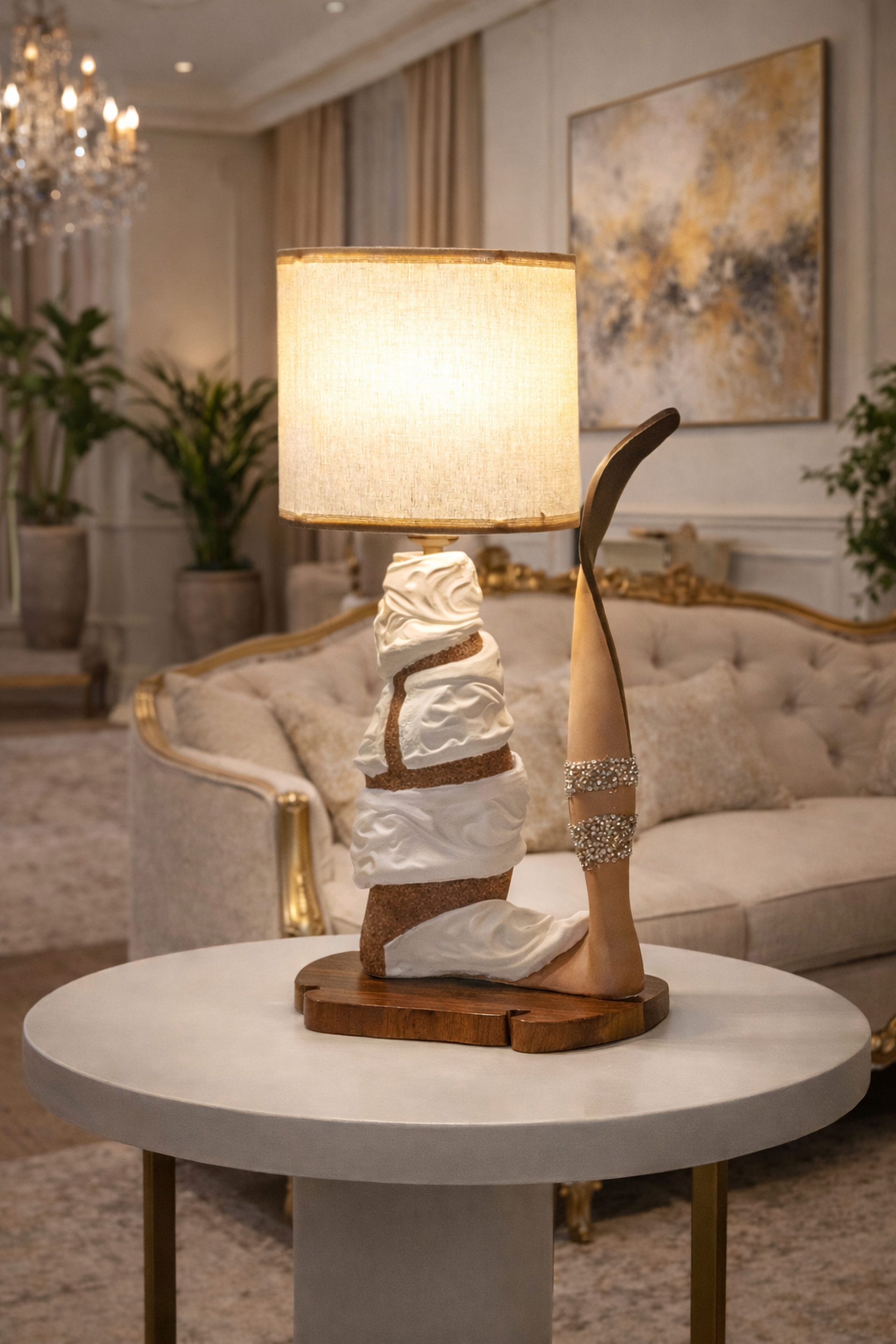 Decorative table lamp featuring a sculptural, art-inspired base with layered textures and flowing contours. The design combines carved natural elements with smooth, draped detailing, paired with a round fabric shade that diffuses light into a soft, warm glow. Set on a solid wooden base, this piece brings an elegant, gallery-like presence to consoles, side tables, or bedside spaces.