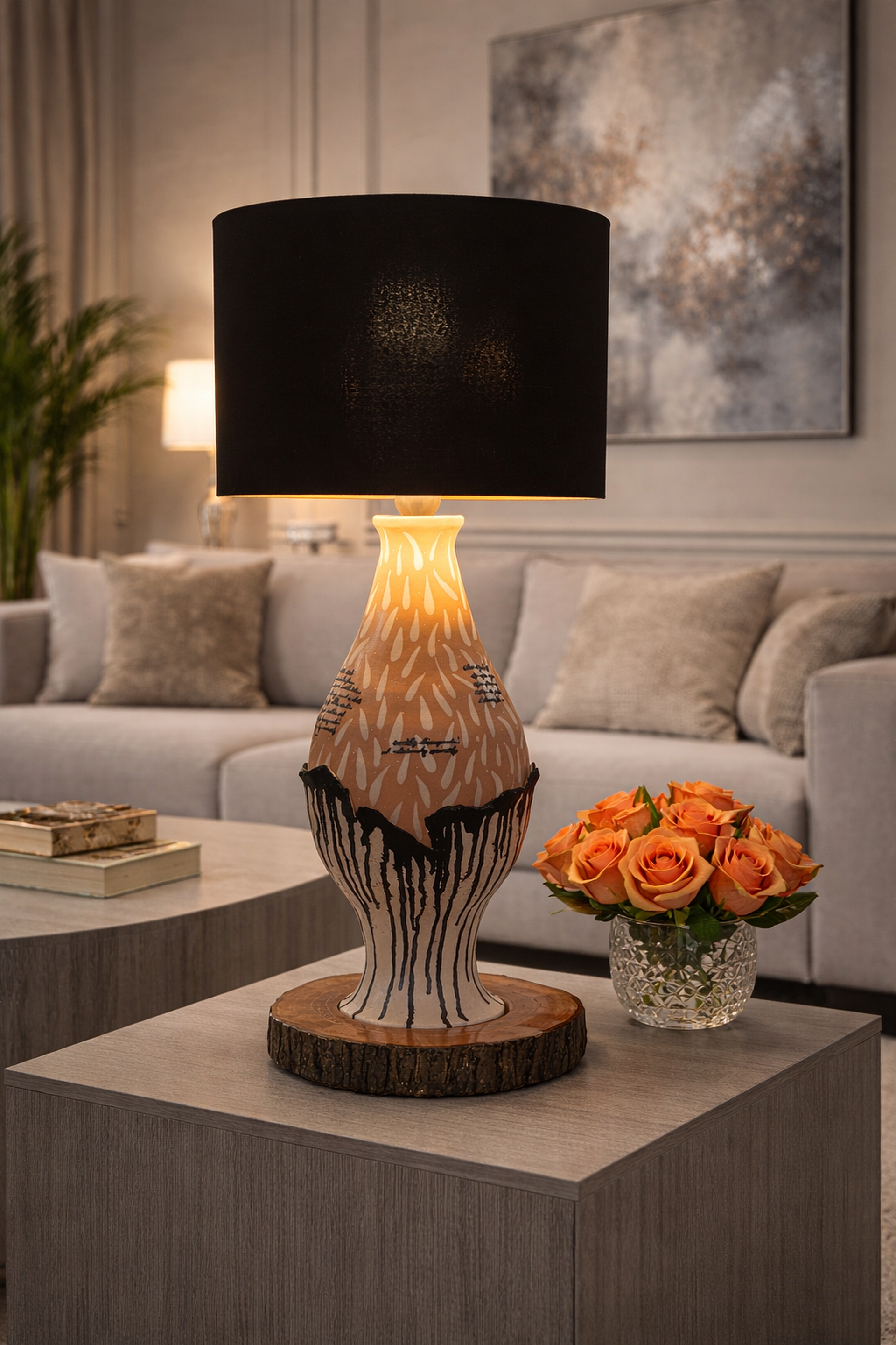 Decorative table lamp featuring a sculptural ceramic base with a hand-painted, drip-style design and subtle script detailing. Topped with a classic black drum shade, it emits a warm, ambient glow. Set on a natural wood slice base, this piece blends artistic character with modern elegance — ideal for living rooms, bedrooms, or accent tables.