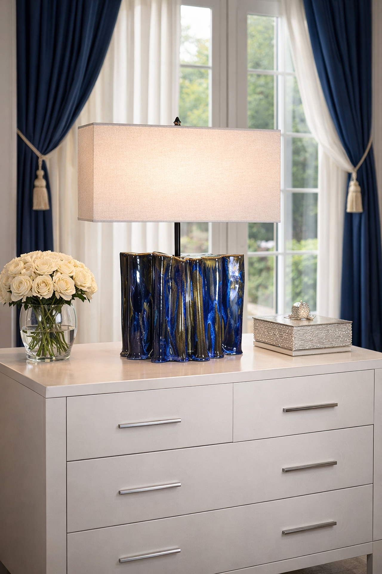 Decorative table lamp featuring a striking sculptural base with a rippled, wave-like form in rich blue and olive tones. The wide rectangular fabric shade provides soft, even illumination, while the dark stem adds a modern contrast. A bold accent piece that brings artistic flair and coastal-inspired elegance to indoor or covered outdoor settings.