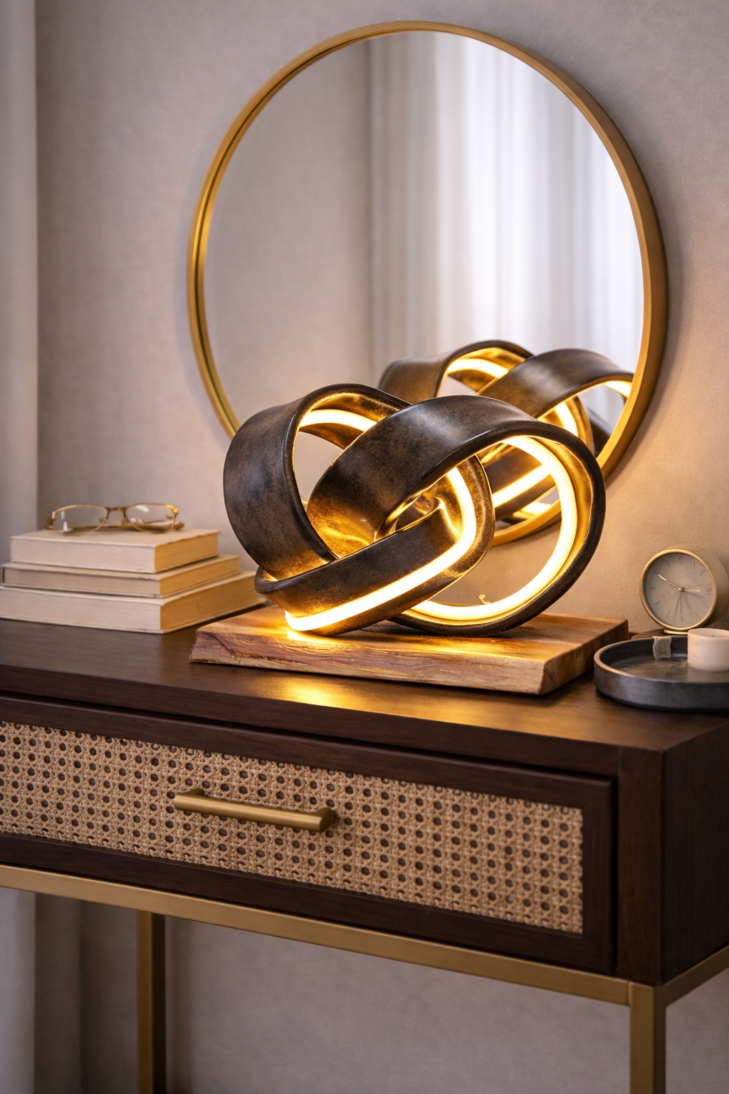 Contemporary sculptural table lamp featuring an abstract, intertwined ring form with a textured dark finish that surrounds an integrated LED light. The circular design creates a captivating play of light and shadow, casting a warm, ambient glow. Resting on a natural wood base, this piece functions as both lighting and modern art — ideal for consoles, side tables, or statement décor in contemporary interiors.