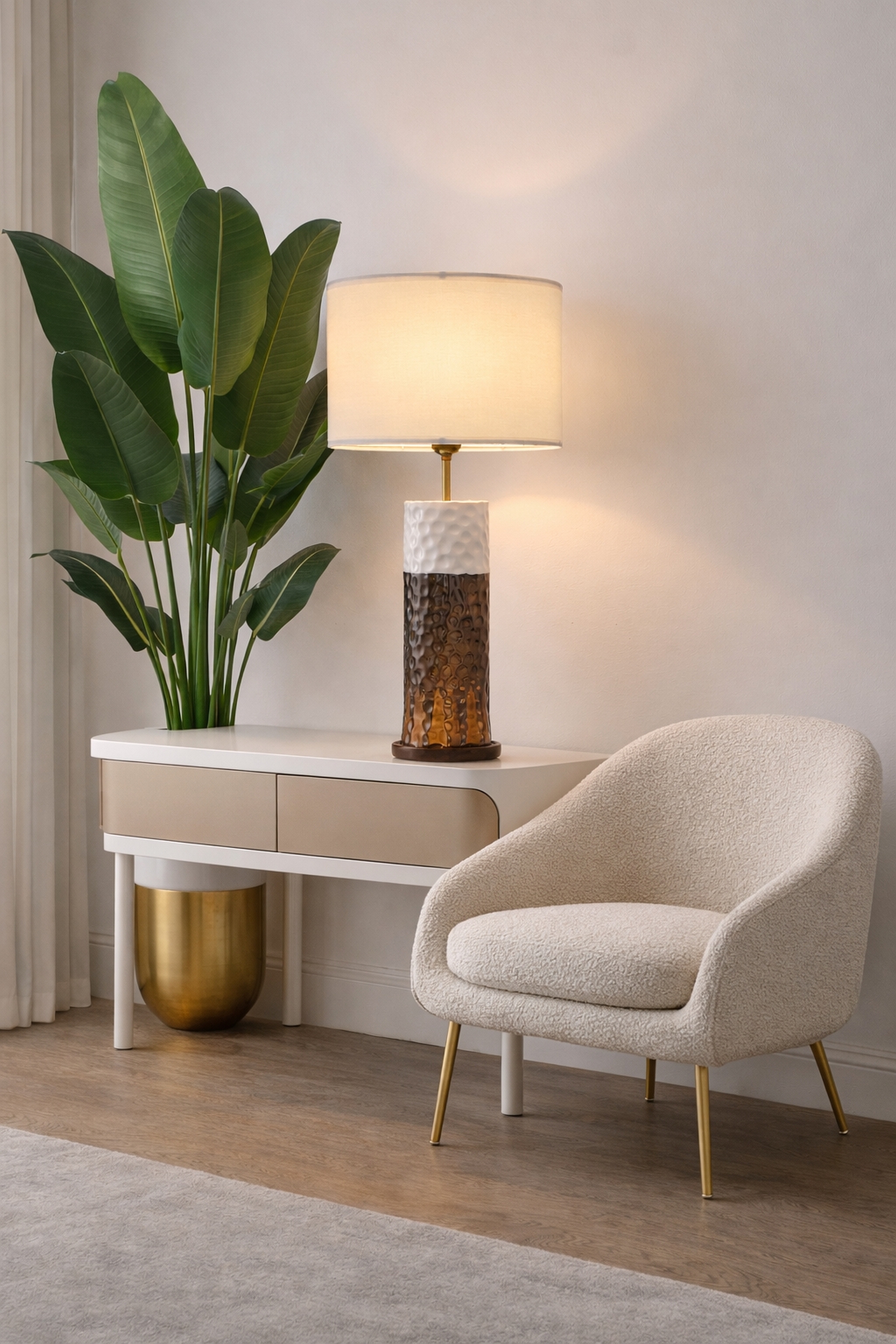 Elegant and refined, this table lamp combines rich texture with warm metallic tones. The cylindrical base features a two-tone design: a softly textured white upper section paired with a deep bronze lower body detailed with subtle, organic patterning. Topped with a clean drum shade, the lamp emits a warm, inviting glow, making it perfect for consoles, desks, or bedside styling in modern and transitional interiors.