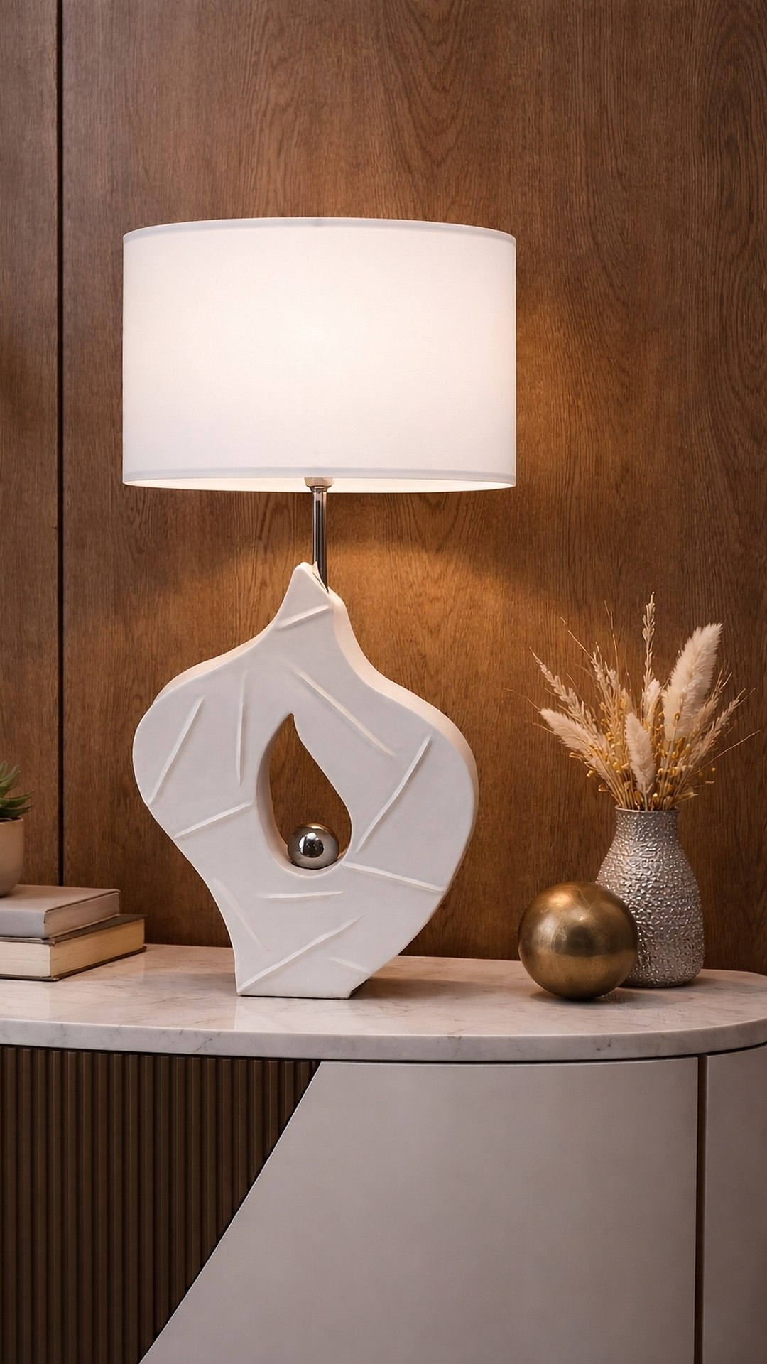 A distinctive handcrafted ceramic table lamp designed as a sculptural accent for contemporary interiors. Its organic silhouette and textured detailing highlight the artistry of handmade ceramics, while the open form and polished metal sphere introduce a modern decorative element. Finished with a clean cylindrical fabric shade, this piece delivers soft ambient lighting while functioning as an elegant design object for consoles, side tables, or bedside settings. Each lamp is individually crafted, making every piece unique.