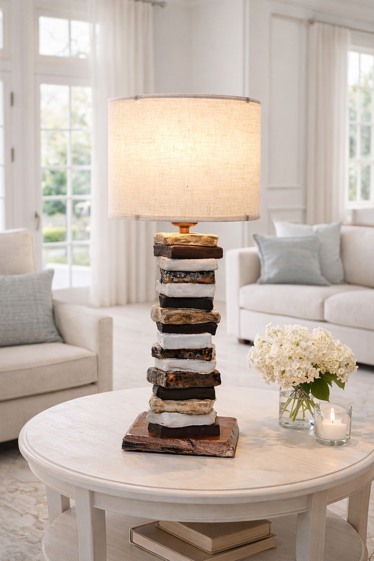 A distinctive table lamp crafted from stacked ceramic elements, each shaped and glazed by hand to create a dynamic, sculptural composition. The layered geometric forms highlight the character of handmade ceramics, with natural variations in glaze and texture that give every piece a unique visual rhythm. Topped with a soft fabric shade, the lamp provides warm ambient lighting while serving as an expressive decorative accent for modern and eclectic interiors.